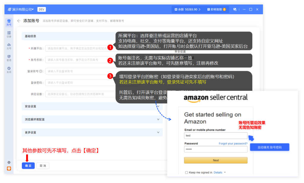 填写要运营的平台和账号信息,账号名称仅用于区分,无需与实际店铺名称一致,环境设置按默认即可;
