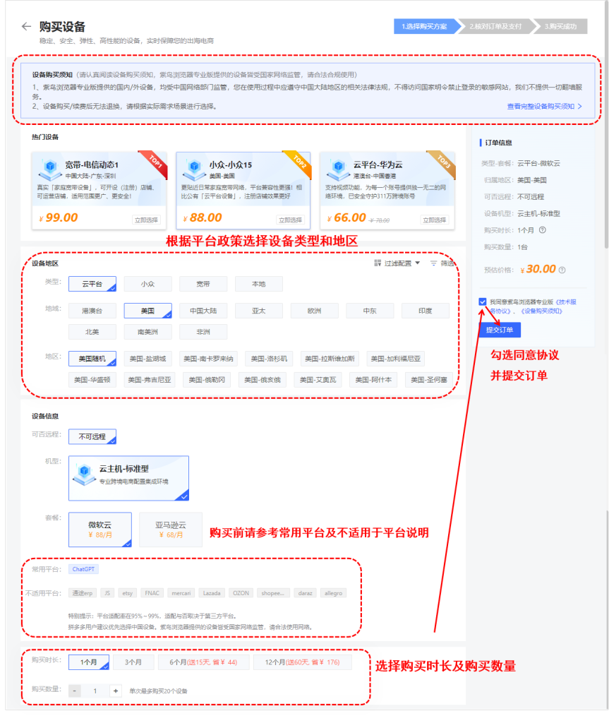 如亚马逊店铺,选择云平台设备即可。由于各平台政策存在差异,请根据平台政策谨慎选择合适的套餐,购买前请认真阅读“设备购买须知”以及套餐下发的套餐说明;