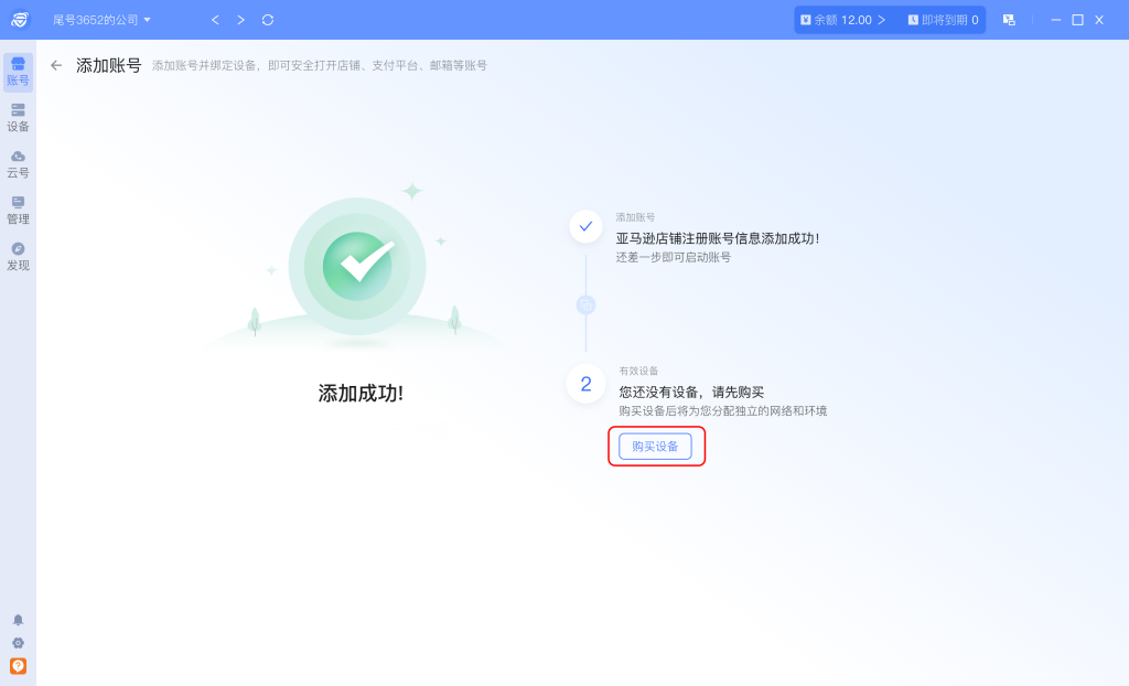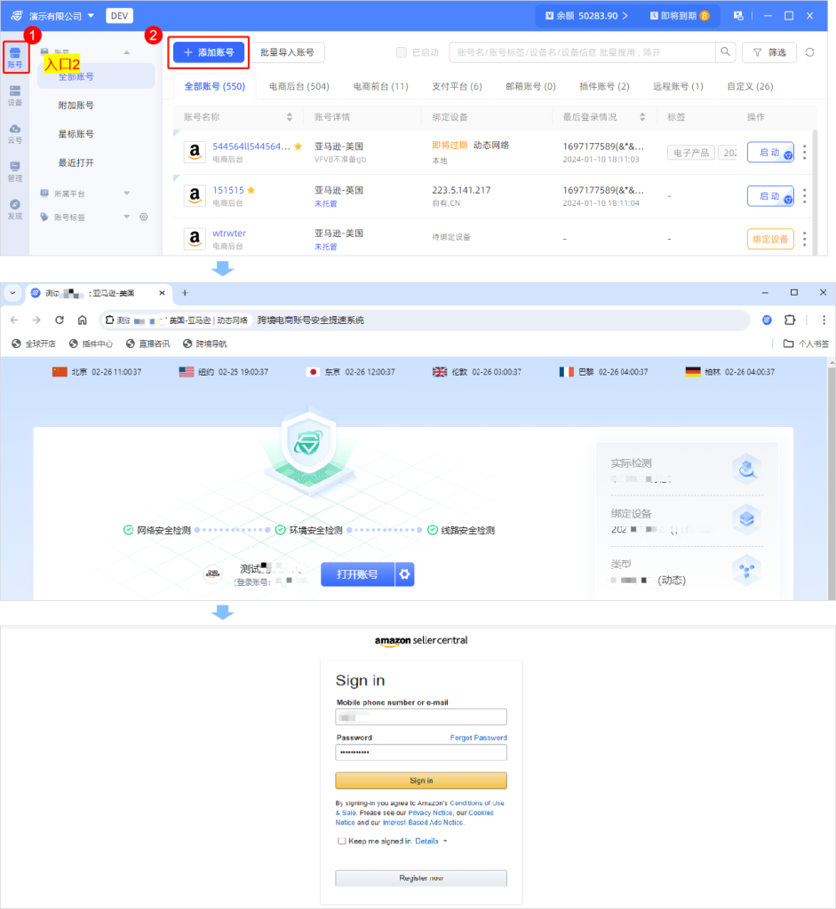 设备下发完成后,点击启动跳转到账号窗口,点击打开账号会直接打开店铺平台站点;