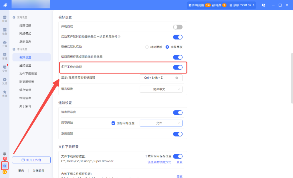 登录任意紫鸟账号 → 进入【设置】 → 在【偏好设置】中开启【多开工作台功能】。