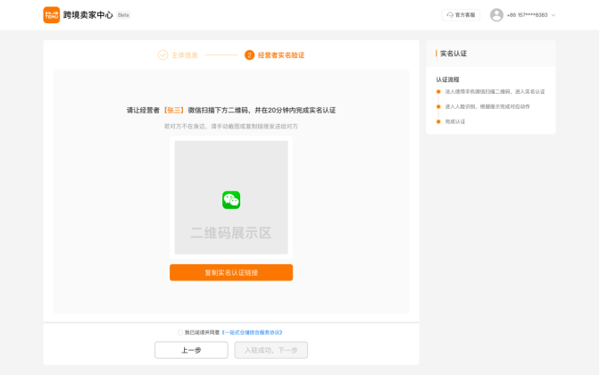 选择注册主体类型(企业/个体工商户),随后上传营业执照及法人代表身份证照片,并进行实名认证。
